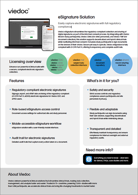 Viedoc eSignature streamlines the regulatory-compliant collection and sharing of digital signatures. Embedded in our eClinical suite, it facilitates informed consent by enabling study participants to sign documents on the devices of their choice. The solution fully complies with 21 CFR Part 11, offering transparency and complete audit trails.